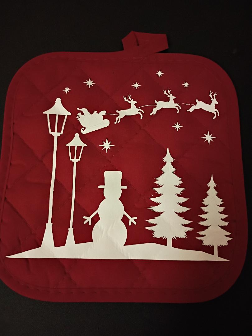 Decorative potholders with Christmas scenes. Use for all your holiday baking needs or buy as the perfect decorative yet functional gift for another. Potholders are 6.5 by 6.5 inches. Select a scene and you will get a matching pair or select a combination pair.