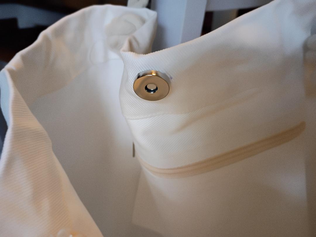 Durable canvas tote bag. Cute rope handles. Closes with a snap. Has a small, zippered pocket inside as well.